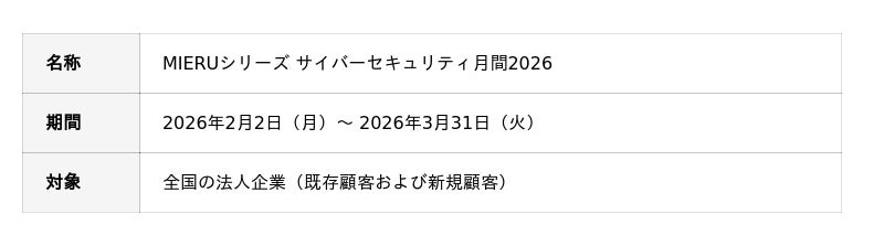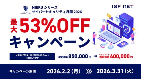 株式会社アイエスエフネット(本社:東京都港区/代表取締役:渡邉幸義、以下アイエスエフネット)は、政府が実施する「サイバーセキュリティ月間」(2026年2月1日~3月18日)に合わせ、企業のセキュリティ対策を支援するキャンペーン「MIERUシリーズ サイバーセキュリティ月間2026」を開始いたします。