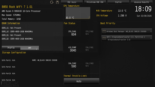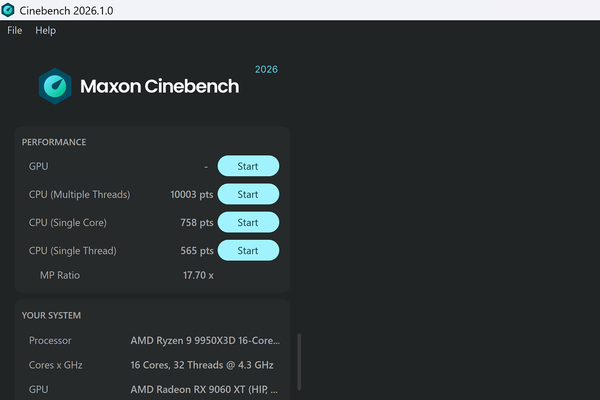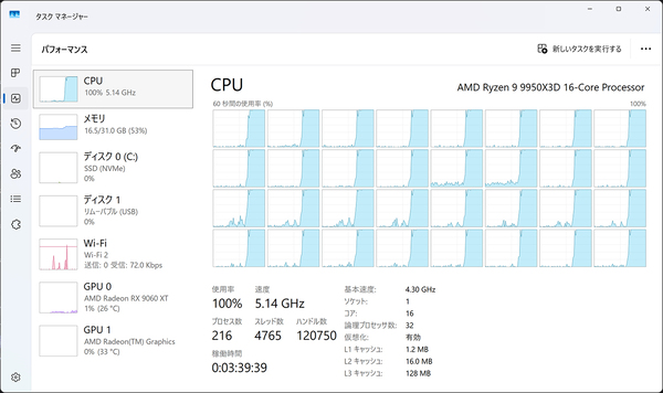 「B850 Rock WiFi 7」をPCケースに組み込み、CPUがフルロードされる「Cinebench 2026」などのストレステストを実行したが、Ryzen 9 9950X3Dのパフォーマンスを問題なく発揮していた。