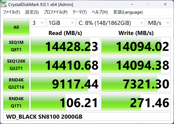 パフォーマンスは、文句なしの読み出し・書き込みともに1万4000MB/秒台を発揮。気になる冷却面は、板状M.2ヒートシンクでもPCケース内のエアフローで十分な放熱効果を得られ、大容量データの読み出し、書き込み時でも、温度は70度を下回っていた。