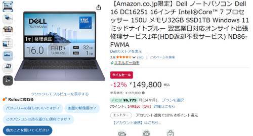 DellのAmazon限定モデル、ノートPC「Dell 16 DC16251」がタイムセール対象。参考価格169,800円のところ、12%オフの149,800円で販売中。