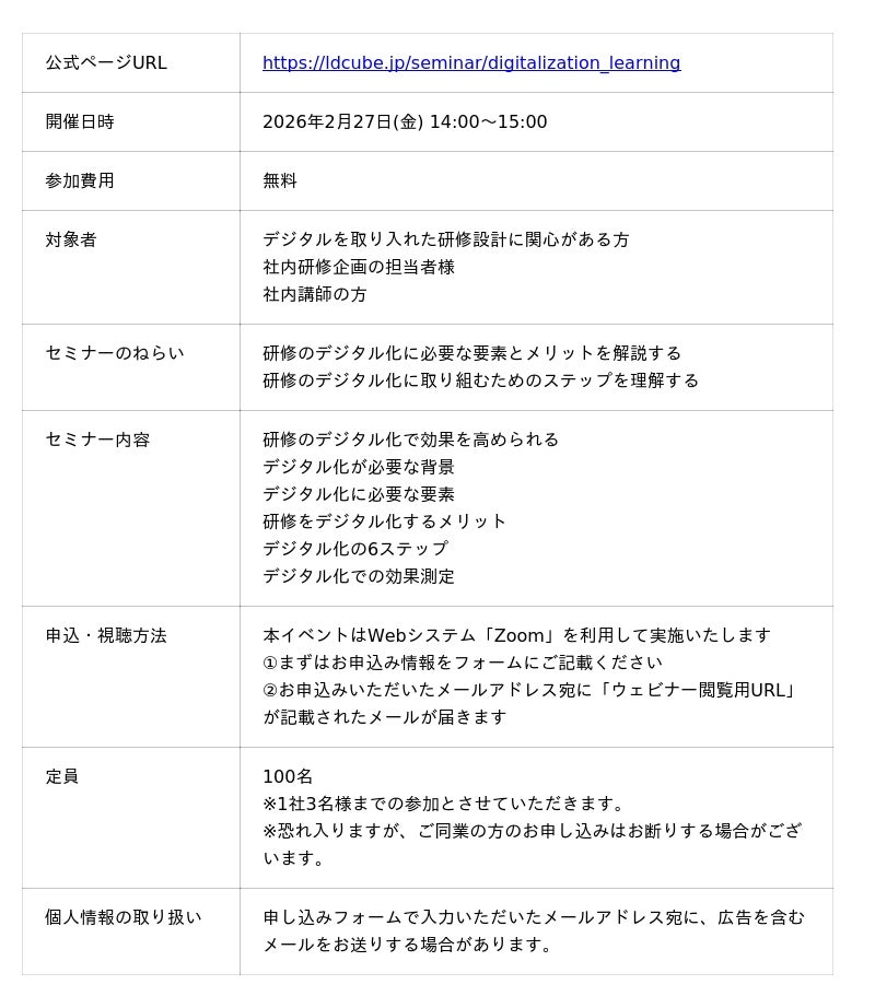 「【研修×デジタル活用】研修の効果を高めるデジタル化とは?~集合研修だけでは足りない要素を解説~」ウェビナーを開催(2月27日14:00~15:00)|株式会社LDcube