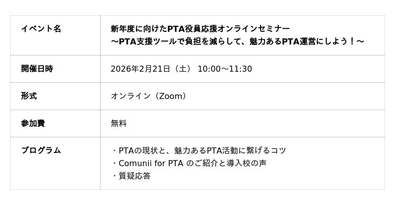 本イベントでは、今の時代に合った多様なPTA運営スタイルを提示するとともに、「Comunii for PTA」を通じて「新しいカタチ」を実現した導入校の事例もご紹介。新年度を控えたPTA役員の皆さまの不安を払拭し、活動を後押しします。