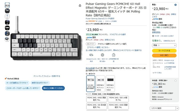 Amazon.co.jpにて、Pulsar Gaming Gearsのゲーミングキーボード「PCMK3HE 60」が販売中だ。価格は2万3980円。