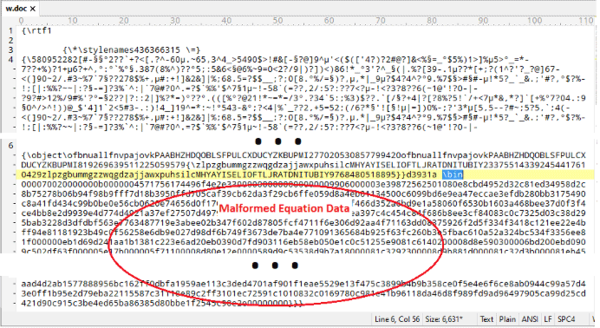 オンラインテンプレートファイルは、細工された不正な形式の数式データを含むRTFファイル(w.doc)です。これは、Microsoft数式エディター(EQNEDT32.EXE)の既知のリモートコード実行(RCE)脆弱性CVE-2017-11882を引き起こします。