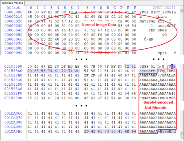 PowerShellコードは、変換されて通常の画像ファイル(実際にJPEGデータが格納されているoptimized_MSI.png)に埋め込まれた.NETモジュール(.NET DLL)をダウンロードします。Base64エンコードされた.NETモジュールはこのようにPNGファイルに付加されて、マーカー BaseStart-と-BaseEndで囲まれます。