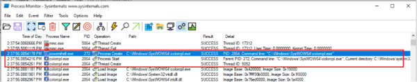 .NETモジュールは次に、プロセスホローイングを使って新たに作成したcolorcpl.exeプロセス内にRemcosペイロードを展開します。ターゲットとなるプロセスは、VAI()メソッドへのパラメータとして指定されます。図12は、PowerShellプロセス内での実行中に.NETモジュールによってcolorcpl.exeが作成されたことを示しています。