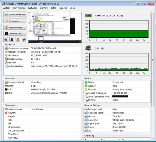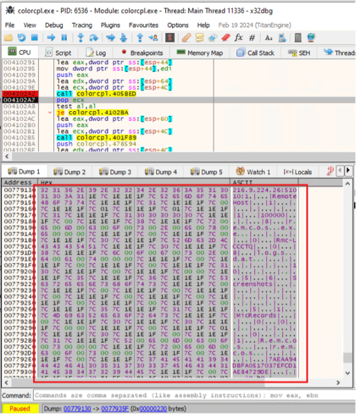 colorcpl.exeプロセス内でRemcosペイロードのエントリポイント関数が呼び出されると、侵害されたコンピュータ上でRemcosエージェントがアクティブになります。