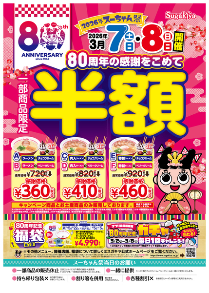 東海地方を中心に展開するラーメンチェーン「スガキヤ」は、創業80周年を記念した企画を3月7日より順次開催します。