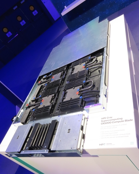 HPE Cray Supercomputing EX254n Compute Blade:1ブレードあたりNVIDIAの GH200を8個、768 GBのHBM3を搭載のコンピュートエンジン。キャビネットあたり最大448個のGH200、8口のHPE Slingshotポートを設置できるという。