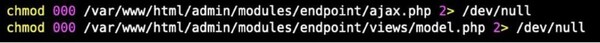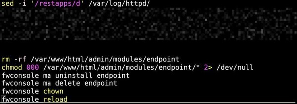 cドロッパー実行の最終段階で、EncystPHPはログファイルを改ざんし、endpointというFreePBX Endpoint Managerモジュールを削除します。これらの処理が完了すると、FreePBX関連ファイルのファイル権限を復元し、サービス例外を回避するための構成を再読み込みします。