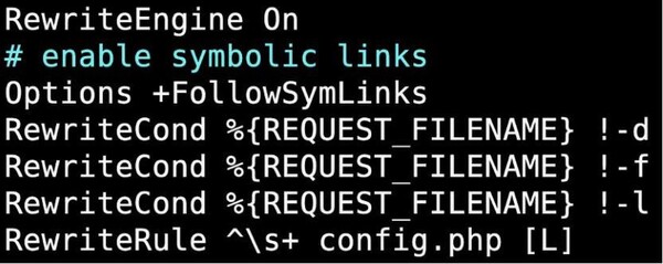 次に、マルウェアはBase64エンコードされた構成ファイルをデコードし、/var/www/html/admin/views/.htaccess に書き込みます。この構成により、URLリダイレクトのための RewriteCond および RewriteRule ディレクティブが有効になります。これらのルールはまず、要求されたリソースがディレクトリでもファイルでもシンボリックリンクでもないことを検証します。最終ルールは、1文字以上の空白文字で始まる要求をconfig.phpにリダイレクトするよう指定します。
