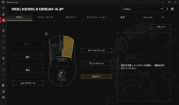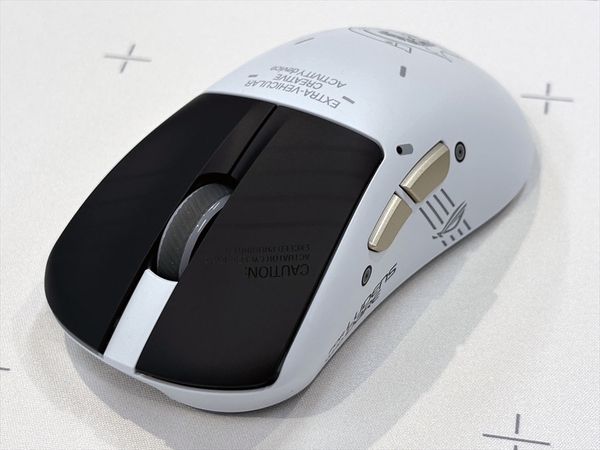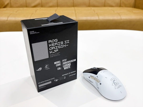 続いて、ゲーミングマウスのROG Keris II Origin-KJPを見ていこう。こちらは既存の「ROG Keris II Origin」をもとにしたコラボモデルだ。カラーリングはヘッドセットと同じく、白を基調として左右のクリック部分は黒のツートン。サイドボタンは金色になっている。