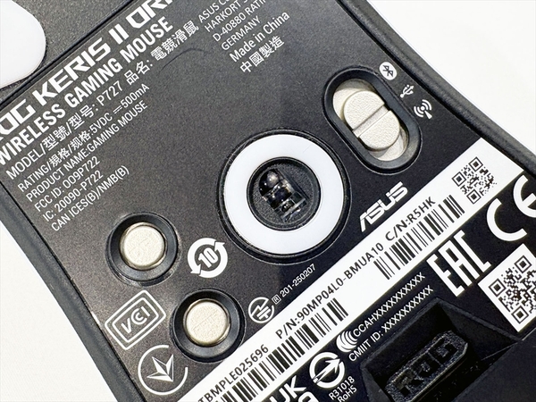 通常モデルはロゴ以外かなりシンプルな外観だったが、ROG Keris II Origin-KJPの場合は随所のデザインがどことなくミリタリーっぽい印象を与える。手のひらが当たる部分には、ルーデンスのロゴがLEDで輝く作りだ。