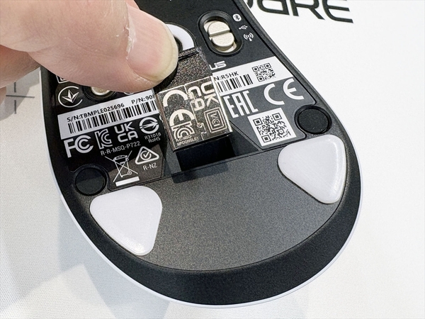 ゲーミングマウスでは定番となっている感度(DPI)切り替えボタンは、底面に配置されている。一見押しにくい印象を受けるが、よく考えればゲーム中にマウスを動かしながら感度を切り替えるという場面は稀だろう。それなら、誤って押すことがない底面にあるのは合理的だ。