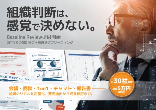 その入口として、短期間で現状の課題と改善の方向性を把握できる「Baseline Review(お試し)」を5万円(税別)で本年1月27日にリリースいたしました。個人・組織の力量を確かめるため、パフォーマンスが良いトーク/悪いトークの違い(構成・論点の置き方・説得の流れ等)や最終版の再レビュー(Before/After比較)として、録画・音声・書類等を2本ご提出いただくことで、分析結果とブリーフィング1時間でフィードバックします。(個人利用の場合は、ブリーフィングに代わりメールもしくはオンラインセミナーにて実施)