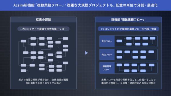 新機能「複数業務フロー」は、1つのプロジェクト内で複数の業務フローを用途や業務単位ごとに分割し、それぞれを独立して作成・管理できる仕組みを提供する。