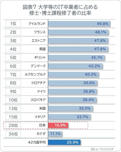 ⇒ STEM教育を受けた卒業者もIT人材になりますが、こちらも日本は過去5年の平均伸び率が0.7%と、G7では下から2番目にとどまります。IT専門教育の早急なテコ入れが必須と言えるでしょう。