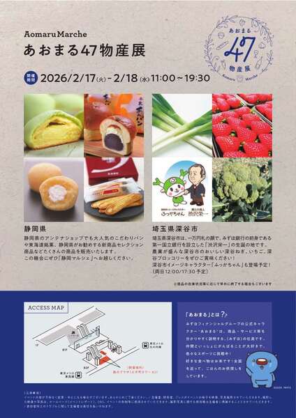 「あおまる47物産展」は、47都道府県の名産品が集まるマルシェ。今回は静岡県と埼玉県深谷市の名産品を販売します。静岡県からは、アンテナショップでも人気のこだわりパンや東海道銘菓、新商品などが登場。深谷市は深谷ねぎやいちご、ブロッコリーなどを販売します。