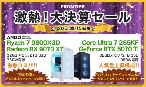 FRONTIERでは、「激熱!大決算セール」を2月20日15時まで実施しています。ゲーミングデスクトップを中心に、週替りセールや月替りセール、即納モデルなどが並び、「バイオハザード レクイエム」や「紅の砂漠」のバンドル対象モデルも用意されています。