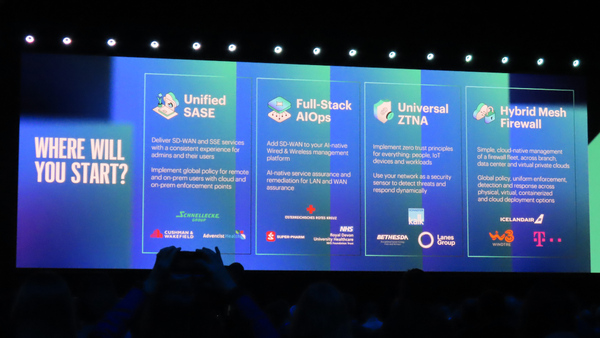 (4)セキュリティでは、旧Aruba幹部であり、SASE/セキュリティ担当SVP兼GMのデビッド・ヒューズ氏が登壇した。ヒューズ氏は「ネットワークとセキュリティの境界があいまいになっている」と語り、Aruba、Juniper双方のセキュリティ機能やセキュリティ製品を紹介した。