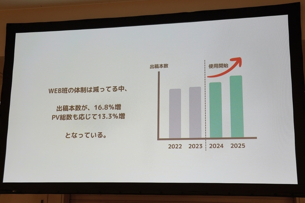 2024年にこうした仕組みの大枠を構築し、ブラッシュアップを続けてきた。実際にどのような変化が生まれたのか。運用後のWeb記事の作成数は、2023年と比べて16.8%増、それに応じてPV総数も13.3%伸びているという。これはチームの人数が削減されている中での成果だ。