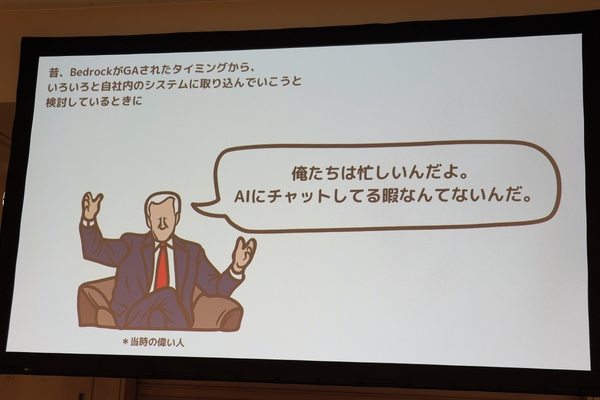 実際にそれを実感するきっかけもあった。AWSがBedrockをGAしたばかりの頃、杉本さんは生成AIで業務を変えようと偉い人に相談する。すると、「AIにチャットしている暇なんてない」と言われてしまう。杉本さんは「結構、的を射ているな」と納得したという。