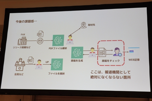 最後に杉本さんは、現状頭を抱えている問題を共有した。当初の目論見通り、原稿を容易にかつ迅速に作成できるようになった。夜当番の経験が乏しい記者に限ると、記事作成数が10倍に増えたほどだ。ただ、報道機関としてなくすことができないのが原稿チェックのプロセスである。原稿が増えた分、最終確認をするデスクの作業量が“10倍”に膨れ上がってしまったのだ。