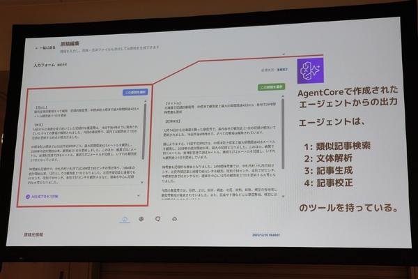 一連の生成AI実装のポイントは、生成AIの代名詞ともいえる「チャットUI」をメインとしていないところだ。「あくまで北海道文化放送の場合だが、チャットUIは“ユーザー負荷”が思ったよりも高い。業務フローに組み込む場合は過剰な機能になってしまう」(杉本氏)