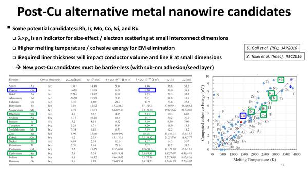 ではCuの代わりとして有望なのはなにか? 候補としてあがっているのはRh(ロジウム)/Ir(イリジウム)/Mo(モリブデン)/Co(コバルト)/Ni(ニッケル)/Ru(ルテニウム)といった材料になる。