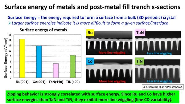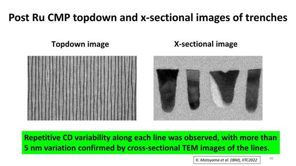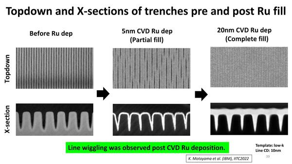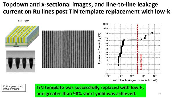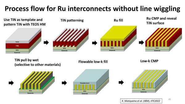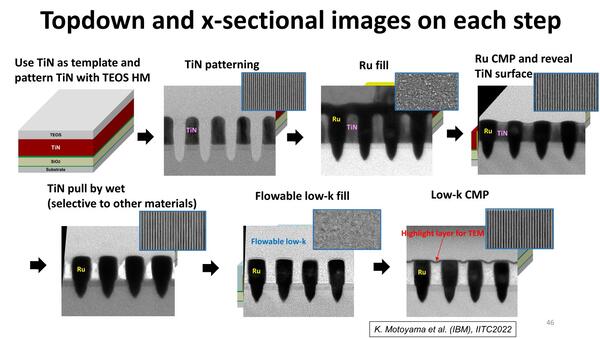 これを踏まえてのRuを利用しての配線構築方法が下の画像だ。つまりまずTiNで型枠を作り、Ruを埋め込んで配線層を構築。次いでCMPで上面を削り取りTiNを除去し、Low-K材料を埋めて完了だ。