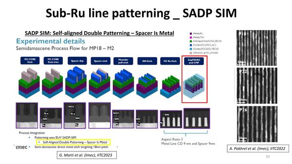 高さを稼ごうとすると、比較的簡単なのはSADPを使って製造することになる。もちろんRu配線が利用されるのはトランジスタ層に比較的近いM0~M3あたりまでなので、SADPが利用されるのはごく普通である。