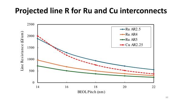 もう1つおもしろいのは、配線ピッチと抵抗の関係。ここまでは16nmの話をしてきたが、銅配線は20nmを切ったあたりから急速に抵抗値が増えるのに対し、Ruでは抵抗値そのものも低いし、上がりかたも緩やかであることがわかる。