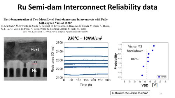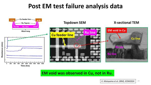 長期信頼性としては、Ruで構築した配線層の上に銅配線層を重ねて長時間稼働をさせたところ、銅配線の方にエレクトロマイグレーションに起因する空所が発生した(つまりRu配線の方は問題なし)としており、高温環境下での耐久試験でもそれなりの信頼性が確保できていることが示されている。
