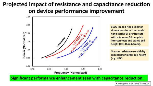 より少ない消費電力で1.22倍の高速性能を実現。配線が動作周波数におよぼす影響の大きさがわかるという話でもある。トランジスタは1nmのナノスタックFETを利用してRing Oscillatorを構築したケースのシミュレーションデータだそうだ