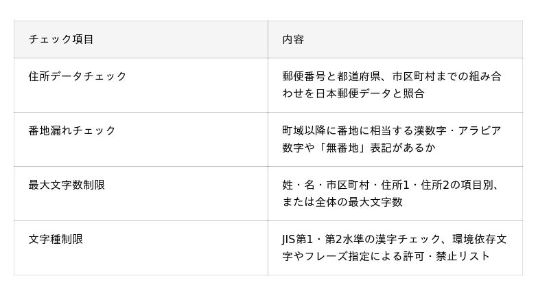 本機能はチェックアウト中の購入体験を考慮した設計になっており、具体的には郵便番号データチェックを市区町村までとしています。背景として、チェックアウト画面で入力エラーが出ると、仕様上お客様はエラーを解消するまで購入に進むことができません。特に町域部分は正しいデータと入力の表記ゆれが発生しやすく、正確な表記を必須にすると、お客様が購入をスムーズに完了できないことから不便な印象を持たれたり、カゴ落ちにつながるといったリスクがあります。