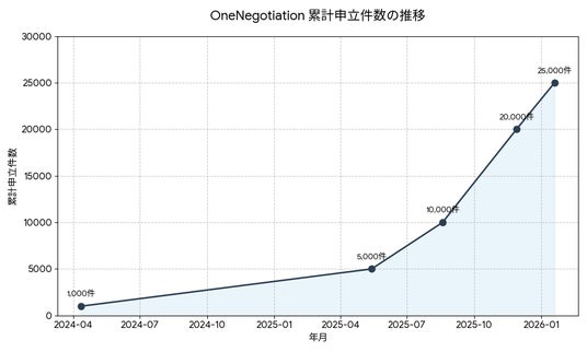 法務大臣認証 対話型ODRプラットフォーム「OneNegotiation(ワンネゴ)」を提供する株式会社AtoJ(本社:大阪市北区、代表取締役CEO:森理俊、代表取締役COO:冨田信雄)は、累計申立件数が2.5万件を突破したことをお知らせいたします。 2025年8月に1.0万件を達成してから、わずか5ヶ月で1.5万件増加。2.5倍の急成長を遂げました。