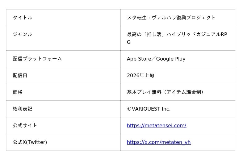 株式会社VARIQUEST(本社:東京都港区)は、開発中の新作スマートフォン向けゲームアプリ『メタ転生:ヴァルハラ復興プロジェクト(以下、メタ転生)』の情報を初公開いたします。