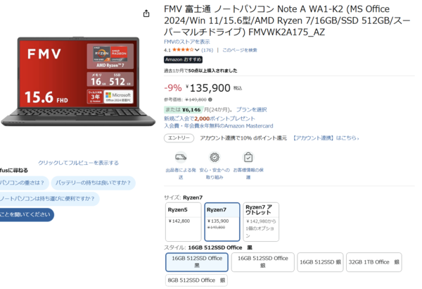 【Amazon.co.jp】富士通 ノートPC「FMV Note A WA1-K2」が135,900円!