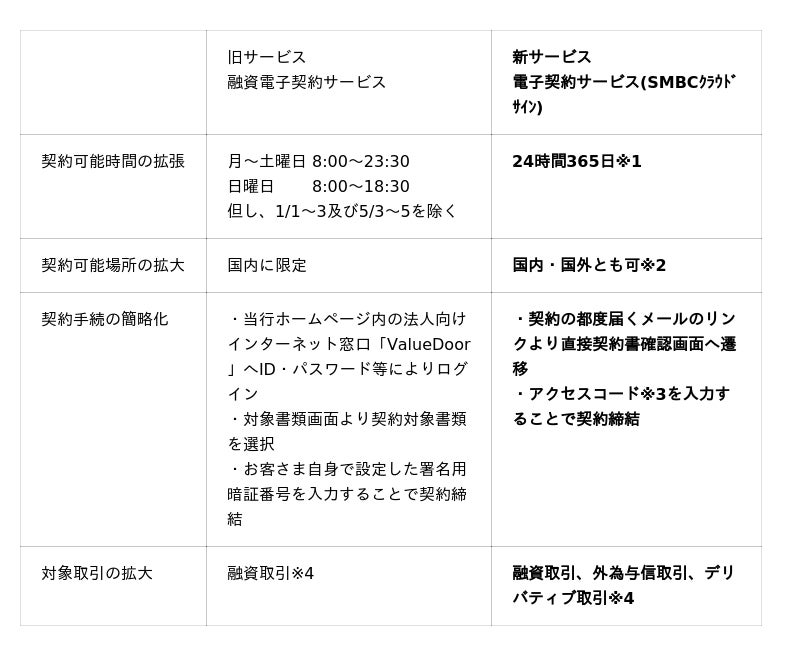 株式会社三井住友銀行(頭取CEO:福留 朗裕、以下 「三井住友銀行」)は、SMBCクラウドサイン株式会社(代表取締役社長:三嶋 英城)が提供するクラウド型電子契約サービスを導入のうえ、法人向け電子契約サービスを刷新し、提供を開始しましたので、お知らせいたします。