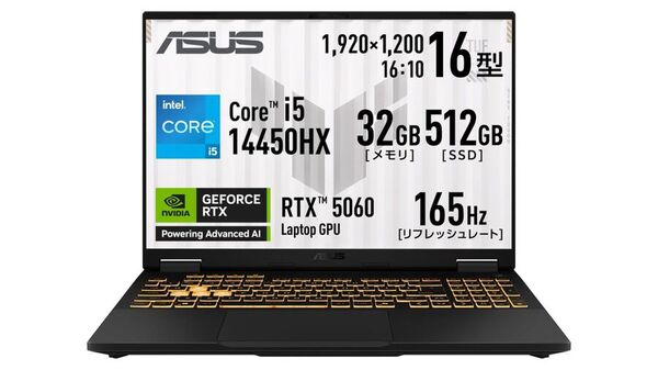 TUF Gaming F16(FX608JMR)の構成は、インテル「Core i5-14450HX」(10コア/16スレッド、最大4.8GHz)、NVIDIA「GeForce RTX 5060」(8GB GDDR7)、メモリーは32GB(DDR5-5600)、512GB M.2 SSDなど。そのほか、解像度は1920×1200ドット、リフレッシュレートは165Hzとなっている。