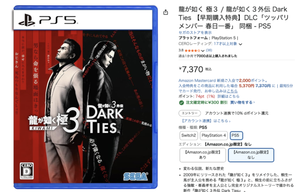そんな私が今ハマっているのが、「龍が如く 極3 / 龍が如く3外伝 Dark Ties」です。PS5版は7,370円でAmazonから購入できます。