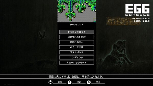 『EGGコンソール ハイドライド3 PC-8801mkIISR』は、アプリケーション標準で用意しているゲーム内のシーンをすぐに楽しめる「シーンセレクト」モードに対応。また、「ギャラリー」モードで、当時の貴重なマニュアルをいつでも閲覧可能だ。