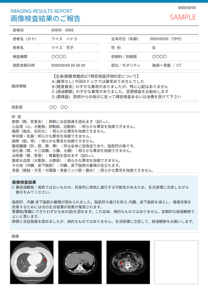 「わかりやすい画像診断レポート」では、従来の「医師(主治医)向けレポート」に加え、「患者向けレポート」をワンストップで納品。診療における説明補助資料としてはもちろん、人間ドック・健診の結果報告としても活用可能とのこと。