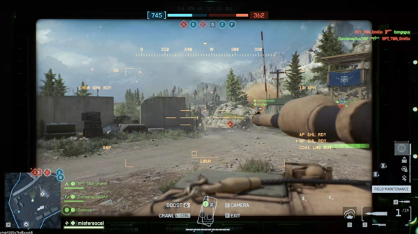 戦闘については、戦車やヘリ、軍用車などさまざまな乗り物が利用できるので、車輛によって戦況が大きく変わるように感じた。そのため、それに対抗する工兵も重要で、うまく修理したり、逆に敵の車輛をうまく破壊することで、マッチを有利に進められるだろう。先述のとおり、ひらけている場所も多いため、戦車だけでなく素早い車輛もうまく利用すると、ダメージを最小限に抑えて拠点間を移動できる可能性があがると感じた。
