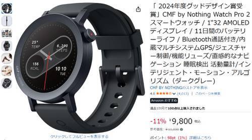 CMF by Nothingのスマートウォッチ「CMF Watch Pro 2」が、参考価格11,000円のところ、11%オフの9,800円で販売中。